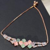 Add a modern twist to your jewelry collection with this stunning rose gold adjustable bracelet, designed with a unique geometric pattern and soft pastel hues. The bracelet features a beautiful combination of square-cut pink and mint green stones, paired with sparkling crystal baguette accents for a sophisticated and contemporary look.