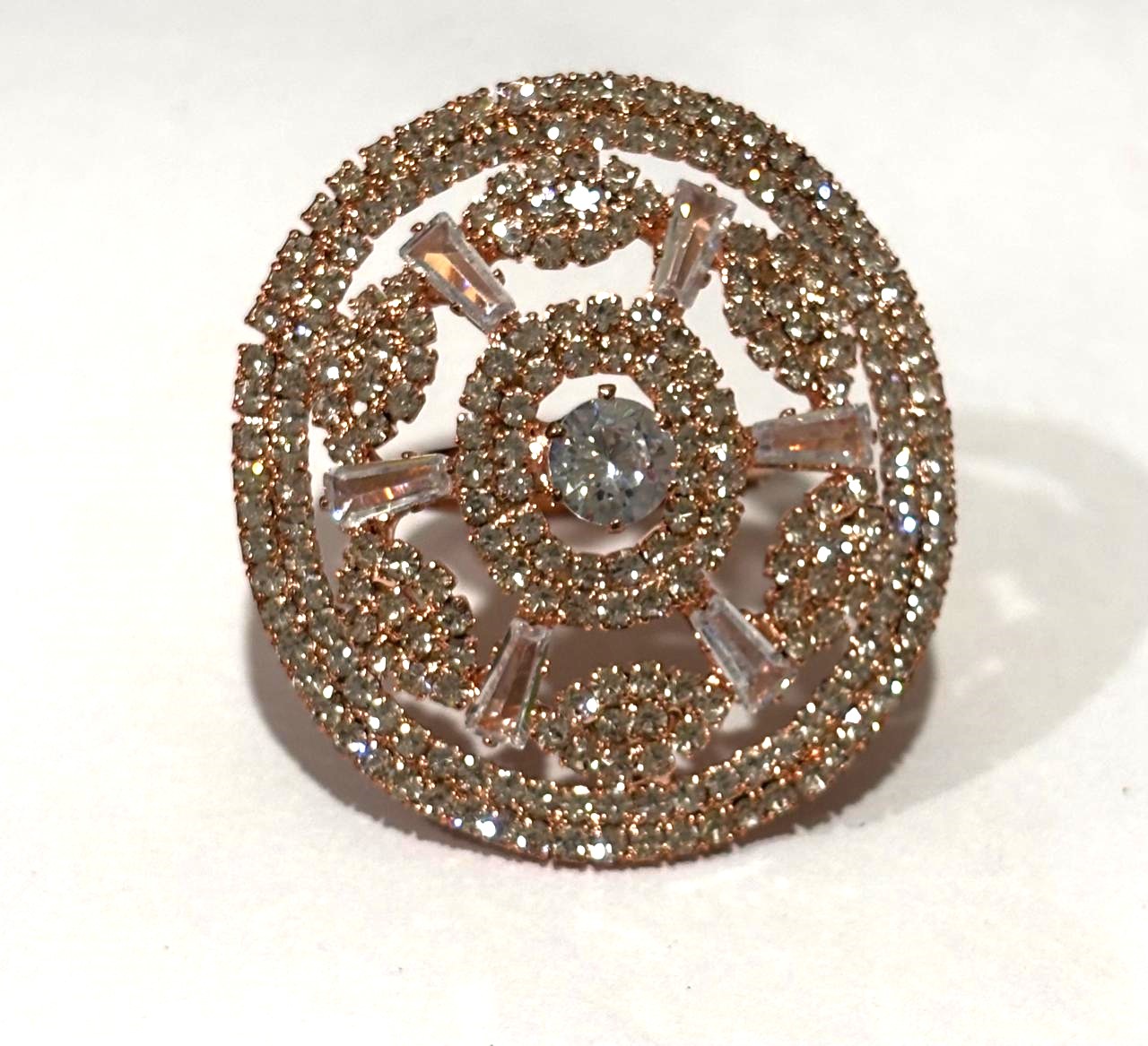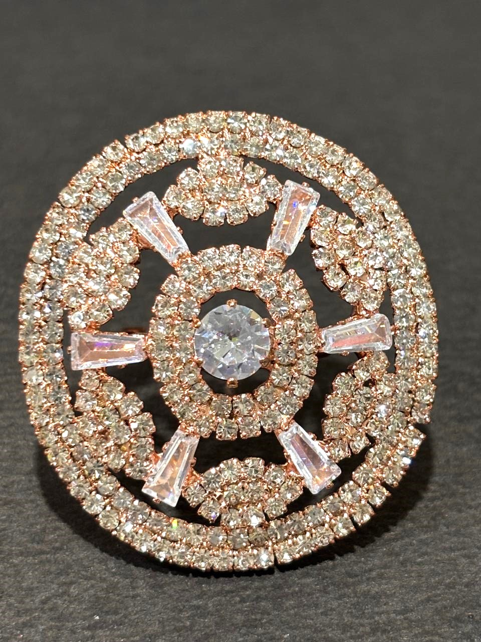 Adorn your hand with this intricate, circular statement ring inspired by mandala designs. The piece features a detailed rose gold-toned lattice filled with shimmering pave-set crystals and accented by structured baguette-cut crystals.