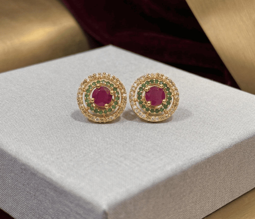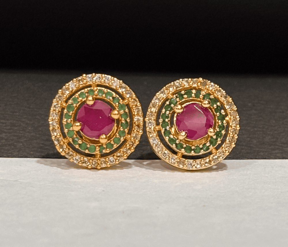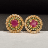 Enhance your traditional look with these elegant ruby and green stone stud earrings. Designed with a beautiful circular pattern, the earrings feature a stunning ruby-colored center stone surrounded by green stones and sparkling crystals that create a rich and eye-catching design.