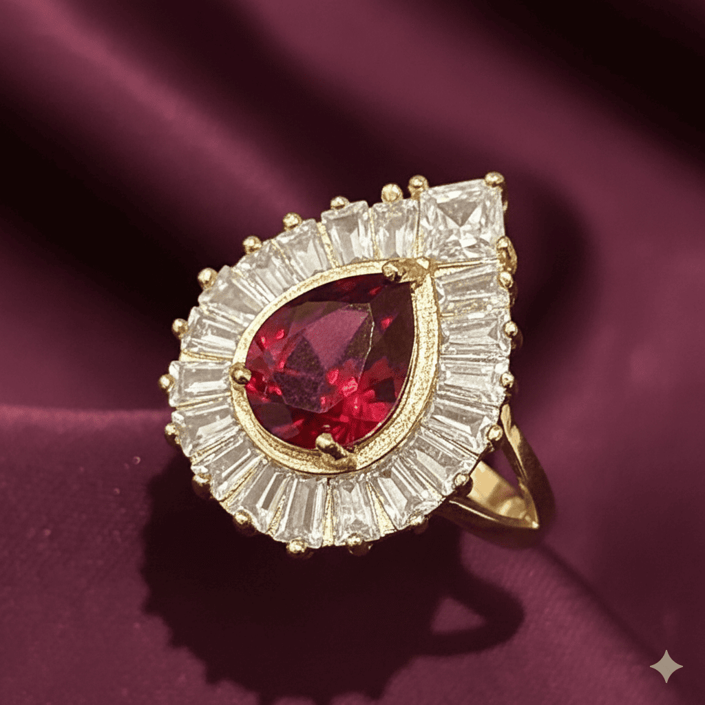 Turn heads instantly with this Ruby Red Pear-Cut Halo Cocktail Ring, designed to deliver bold glamour and timeless elegance. Featuring a dazzling pear-cut ruby red stone surrounded by a sparkling crystal halo setting, this statement ring captures light beautifully from every angle.