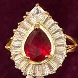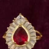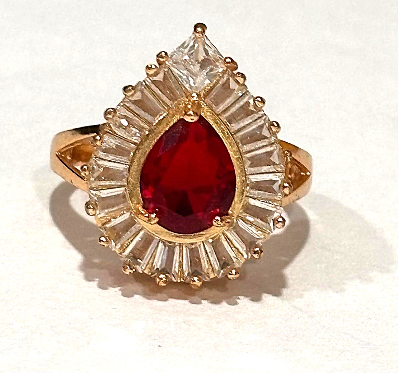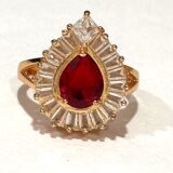 Command attention with the timeless elegance of this Ruby Red Pear-Cut Cocktail Ring. This exquisite piece features a rich, deep red pear-shaped center stone that exudes royal sophistication.