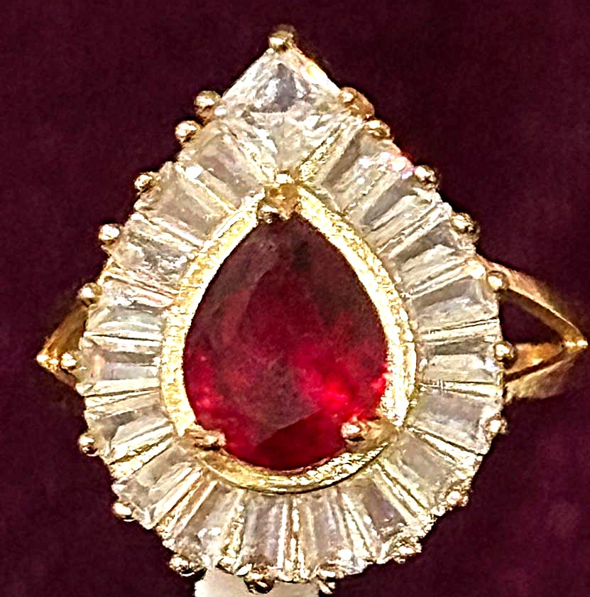 Be the first to review “Ruby Red Pear-Cut Halo Cocktail Ring”