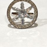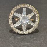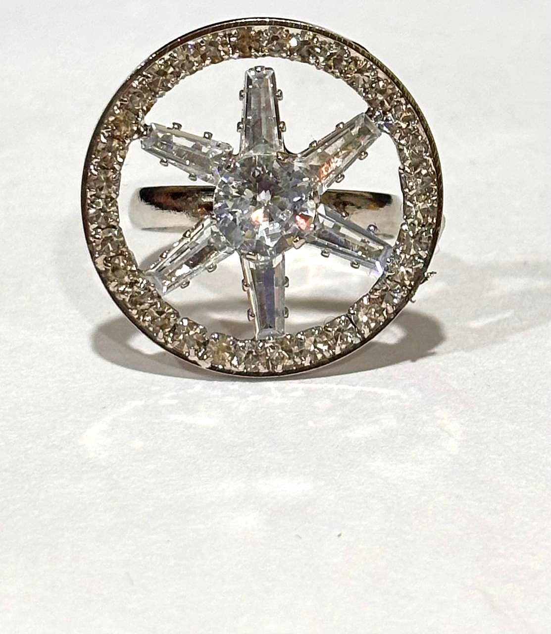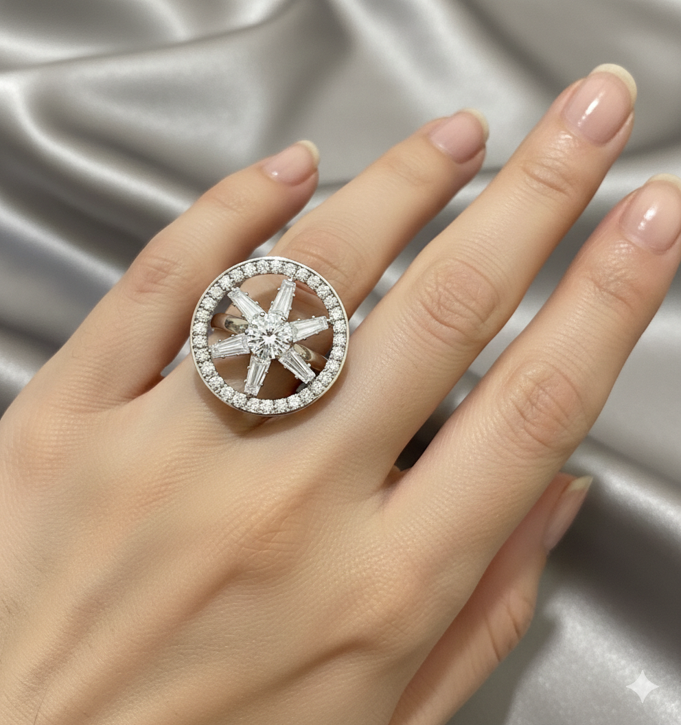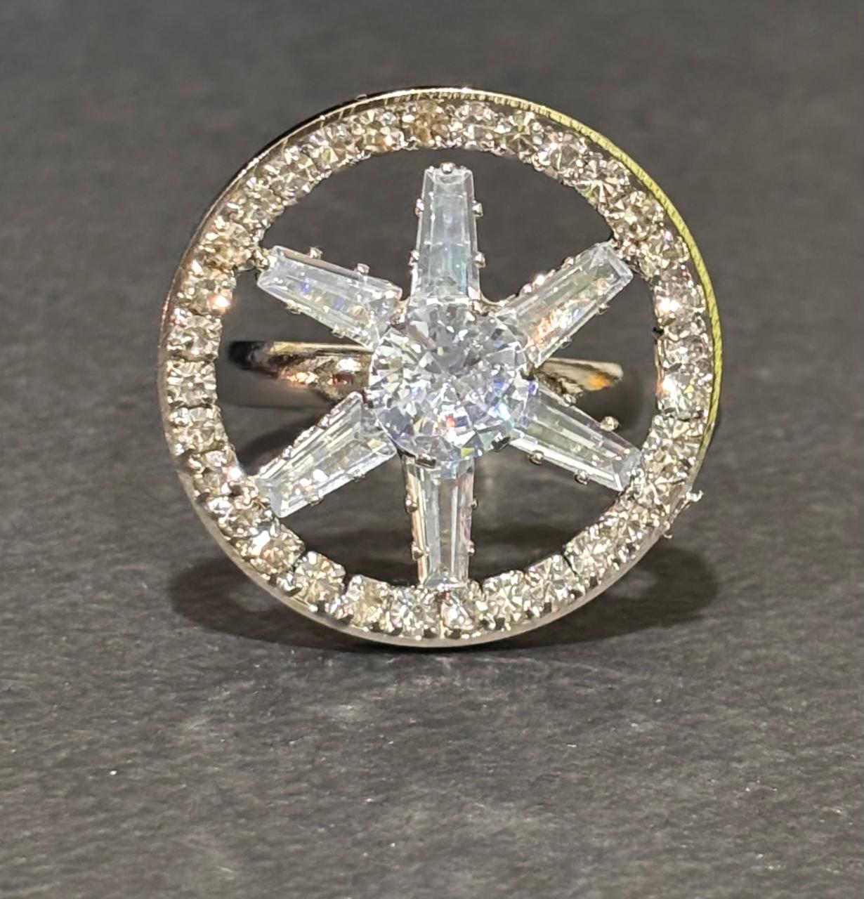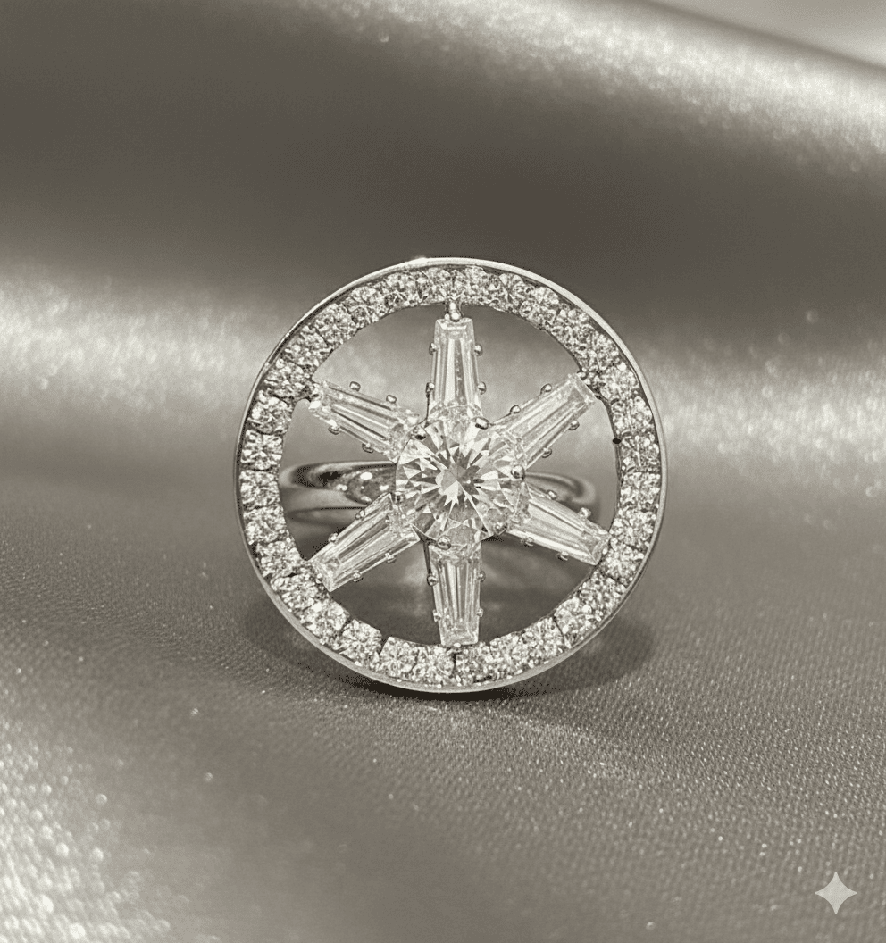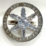 At its heart lies a radiant six-point starburst composed of elegant, elongated baguette-cut crystals that branch out from a brilliant round-cut center stone. The entire motif is encased within a shimmering halo of pavé-set round crystals, creating a sophisticated mandala-inspired silhouette. Mounted on a sleek, polished band, this ring is designed to be a contemporary showstopper.