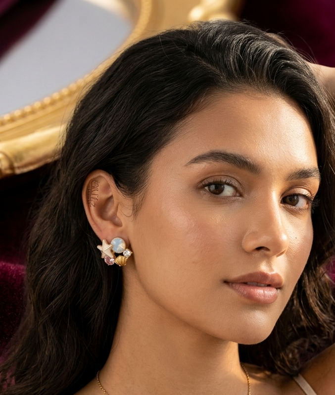 Add a touch of whimsical, beach-side elegance to your collection with our charming cluster earrings. This intricate design features a serene blend of textures and colors, bringing the beauty of the shoreline to life. At its heart sits a luminous, multi-faceted iridescent blue-opal crystal, encircled by a unique assortment of ocean-inspired charms.