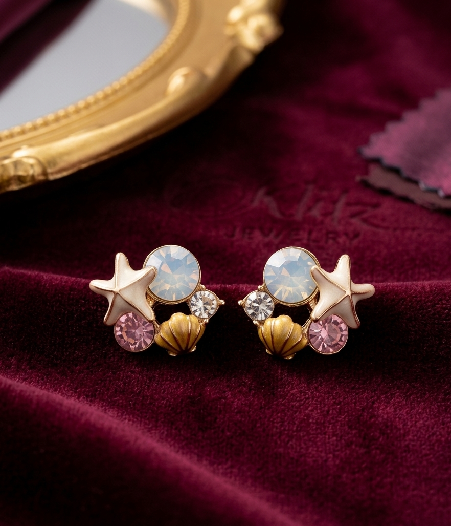 Each earring showcases a detailed cream-colored starfish, a charming golden seashell, a vibrant pink round crystal, and a sparkling clear diamond accent, all meticulously arranged in a gold-toned setting. Perfect for adding a coastal vibe to any outfit, from a simple sundress to an evening look, these cluster studs are a true statement piece for anyone who loves the sea.