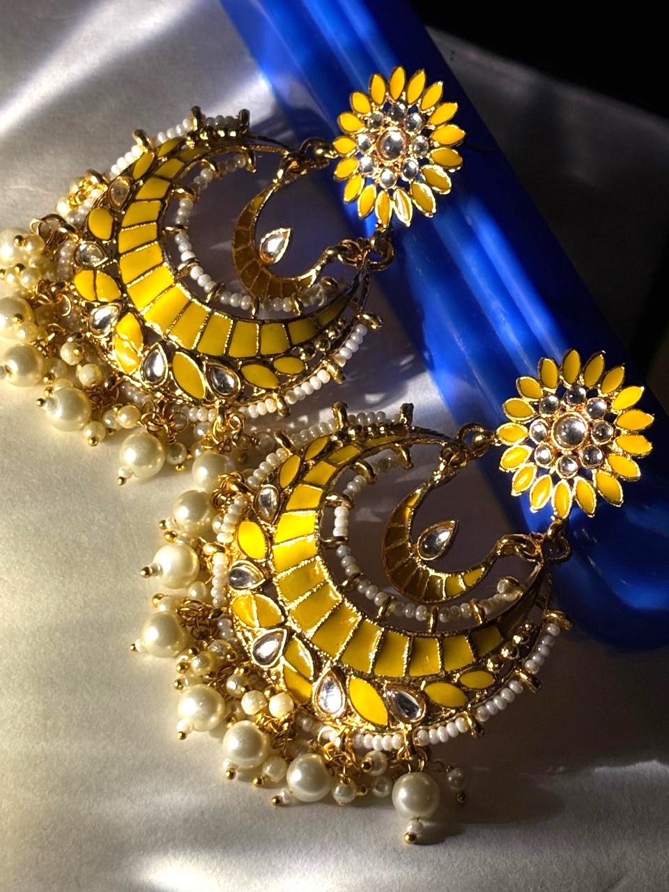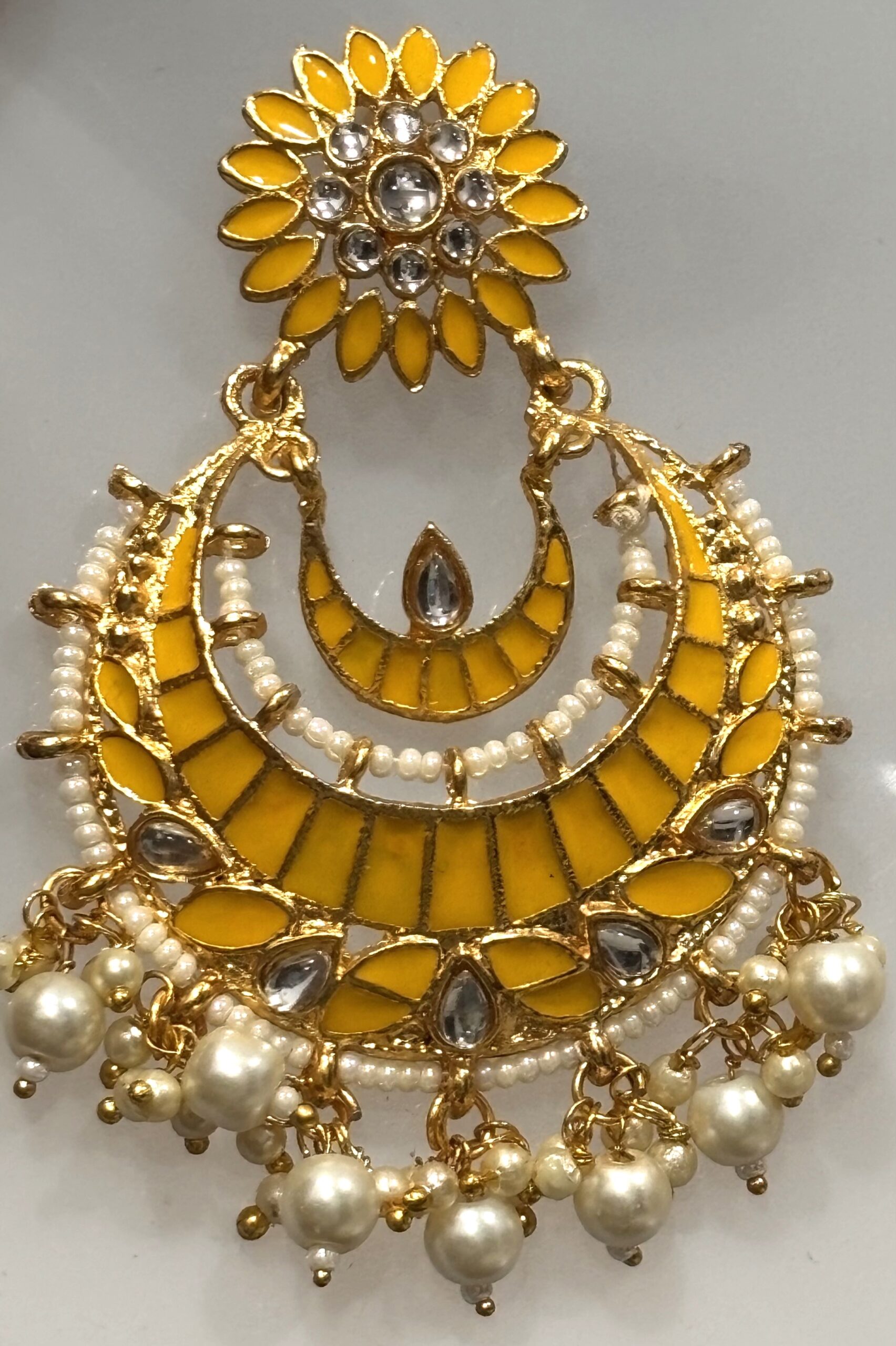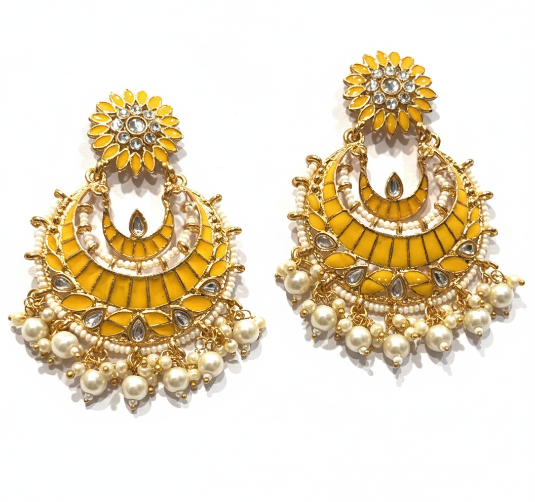 Suspended from the stud is a magnificent crescent-shaped (Chandbali) frame. The frame is intricately detailed with tiered yellow enamel sections and accented with shimmering teardrop and round-cut crystals. The design is beautifully completed with a delicate fringe of creamy white pearls and gold-toned beads, offering a graceful movement and a classic ethnic touch.