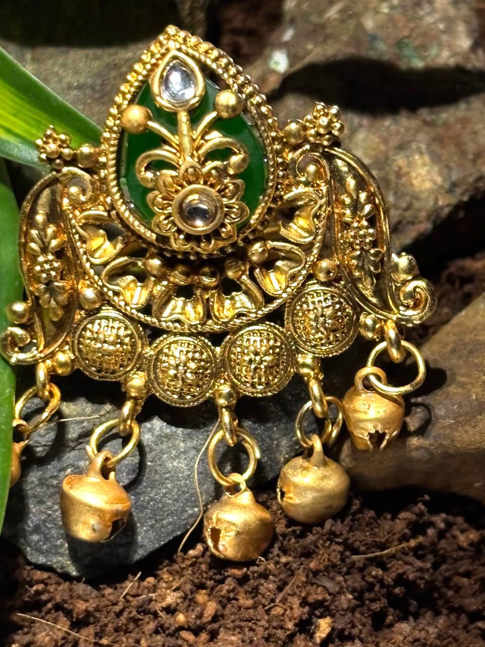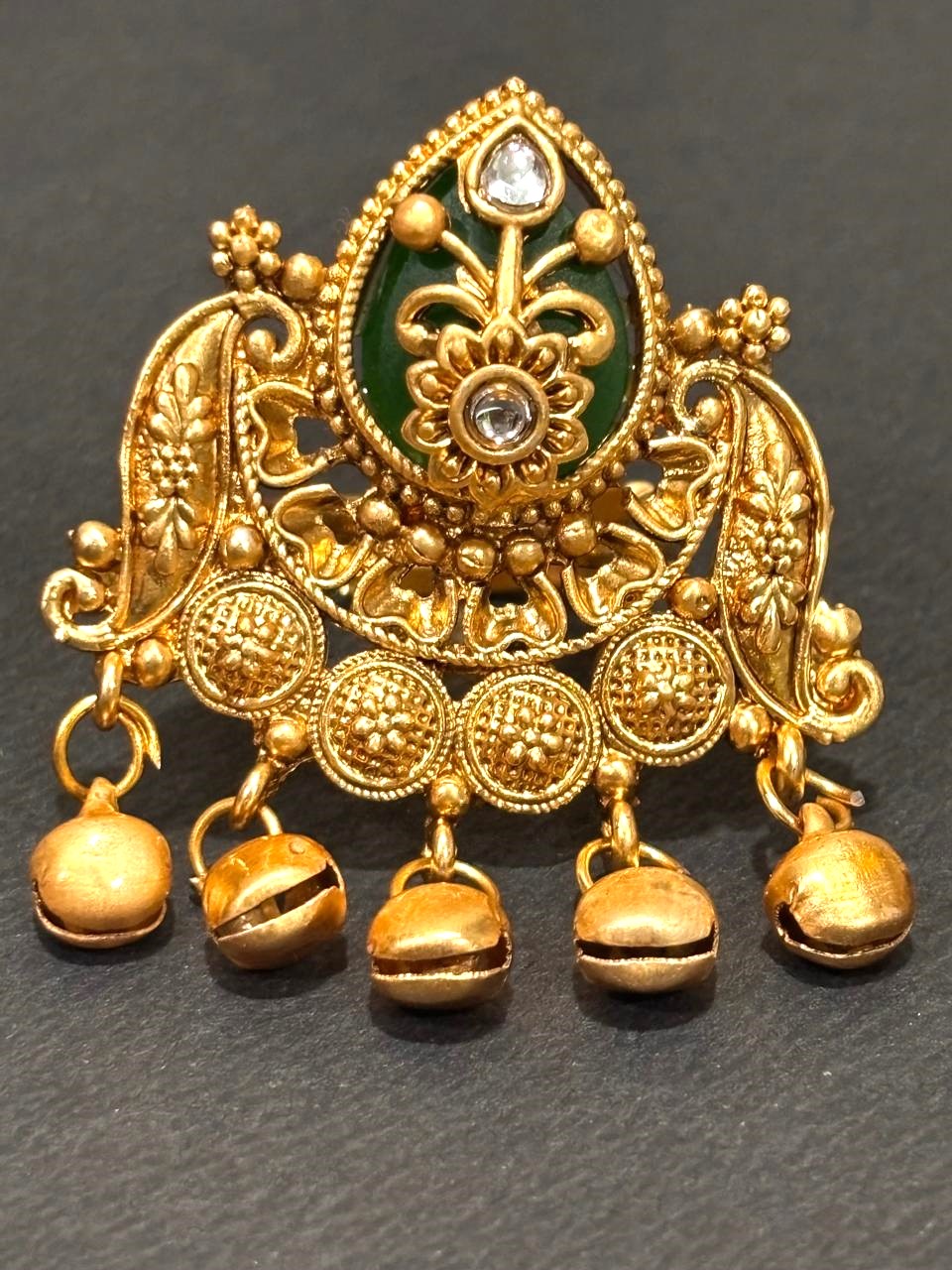This elegant traditional ring features a detailed teardrop-shaped centerpiece with vibrant green enameling and clear stone accents. The intricate, textured gold-toned base is adorned with four hanging gold bells that create a delicate jangling sound with movement.