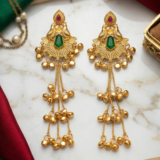This pair of exquisite traditional Indian Jhumka earrings features intricate gold-plated filigree craftsmanship. Each earring showcases a delicate motif and is adorned with a central green octagonal stone and a smaller red teardrop stone. Multiple cascades of long golden chain with clusters of small round golden beads, often referred to as jhumka bells, gracefully drape from the bottom. Perfect for adding an elegant and cultural touch to your traditional or fusion wear.