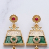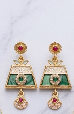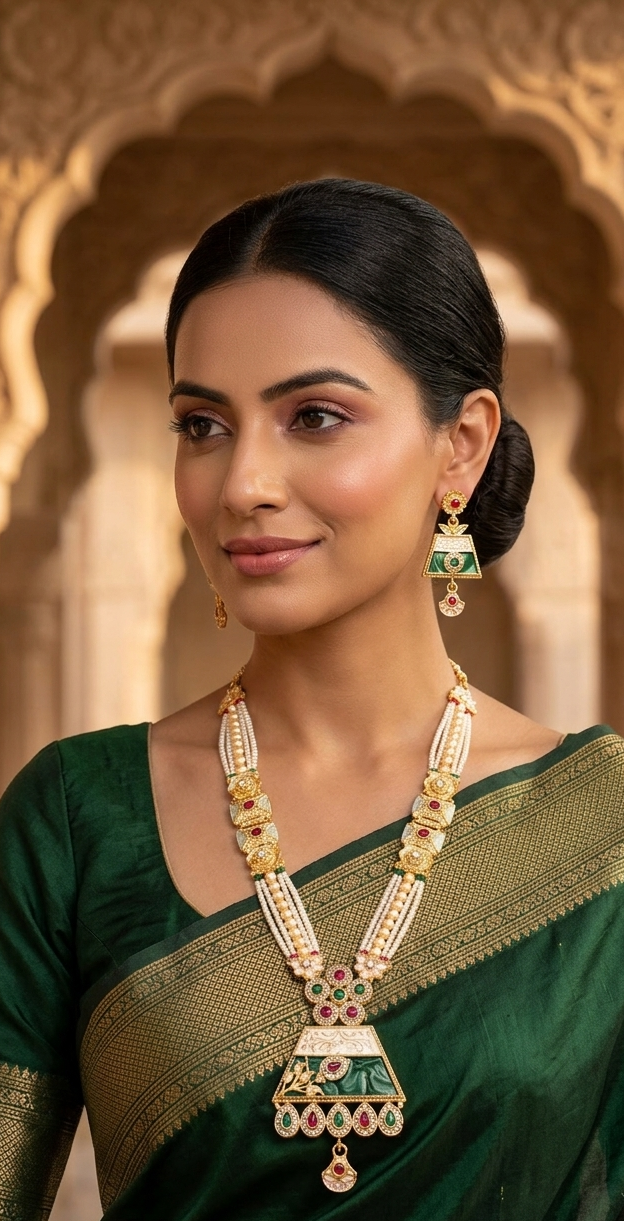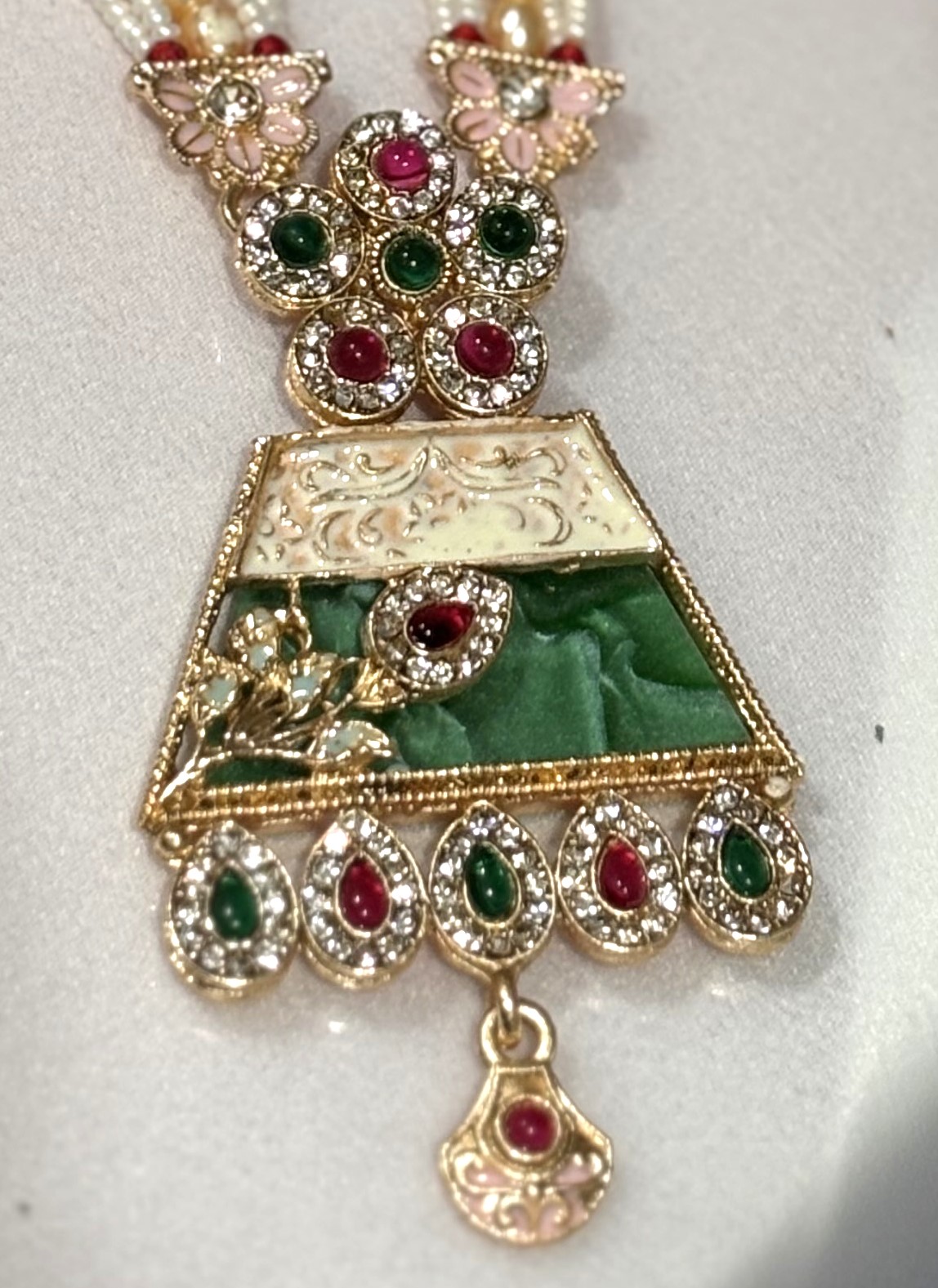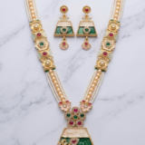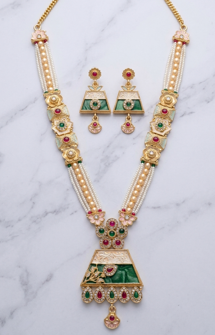 Elevate your ethnic style with this beautifully crafted traditional gold-tone necklace set, designed with intricate detailing and elegant craftsmanship. The set features a stunning layered design with delicate pearl strands, floral motifs, and vibrant green and red stone embellishments that create a regal and timeless look.