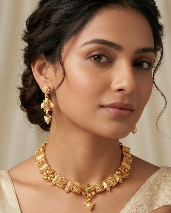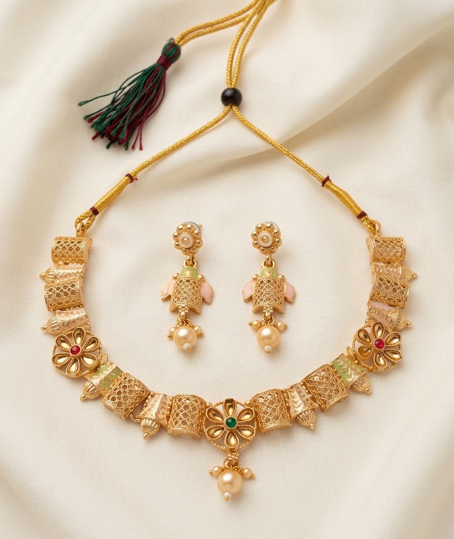 Celebrate your next special occasion with the timeless beauty of our Floral Filigree Set. This exquisite set showcases the fine art of gold-plated metalwork, featuring a row of ornate carved elements and blooming floral patterns. The matching earrings mirror the necklace’s intricate design, complete with polished pearl hangings for a sophisticated finish. Whether it’s a wedding or a festive celebration.