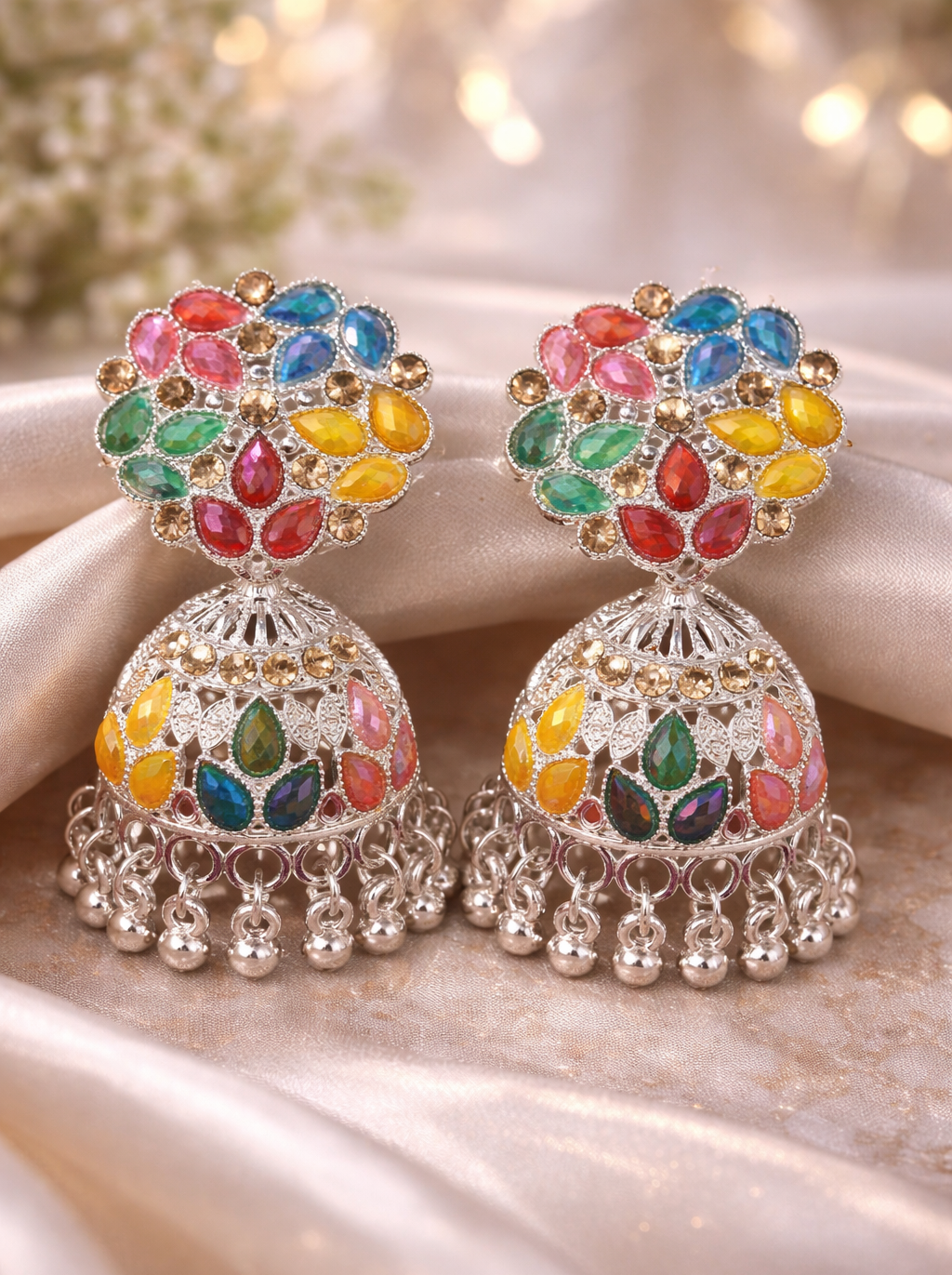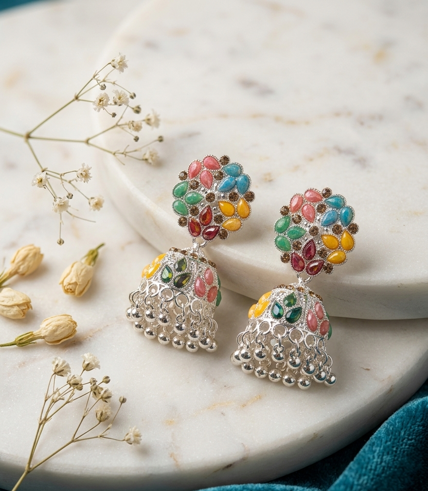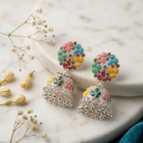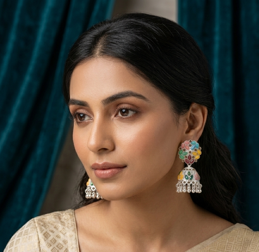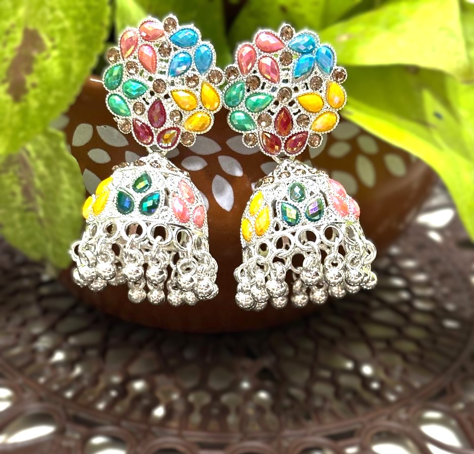 The traditional bell-shaped jhumka drops mirror the colorful design of the studs, featuring intricate cutout latticework and leaf-shaped stone clusters. Finished with a playful fringe of polished silver metallic beads, these earrings offer beautiful movement and a bold, joyful aesthetic.