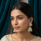 • Design: Large floral-inspired mosaic studs with matching patterned jhumka bells.